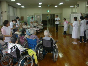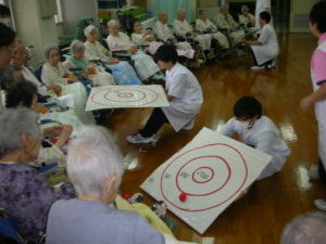 ✿ミニレクリエーションを行いました瀬名病院通信 2020.07.13 2016.06.016月1日(水)の午後に、リハビリ室を利用して職員主催によるミニレクリエーションを行いました。指の体操から始まり、ちょっと楽しいハプニングがあった懐メロの合唱、病棟対抗の的あてゲームを楽しみました。