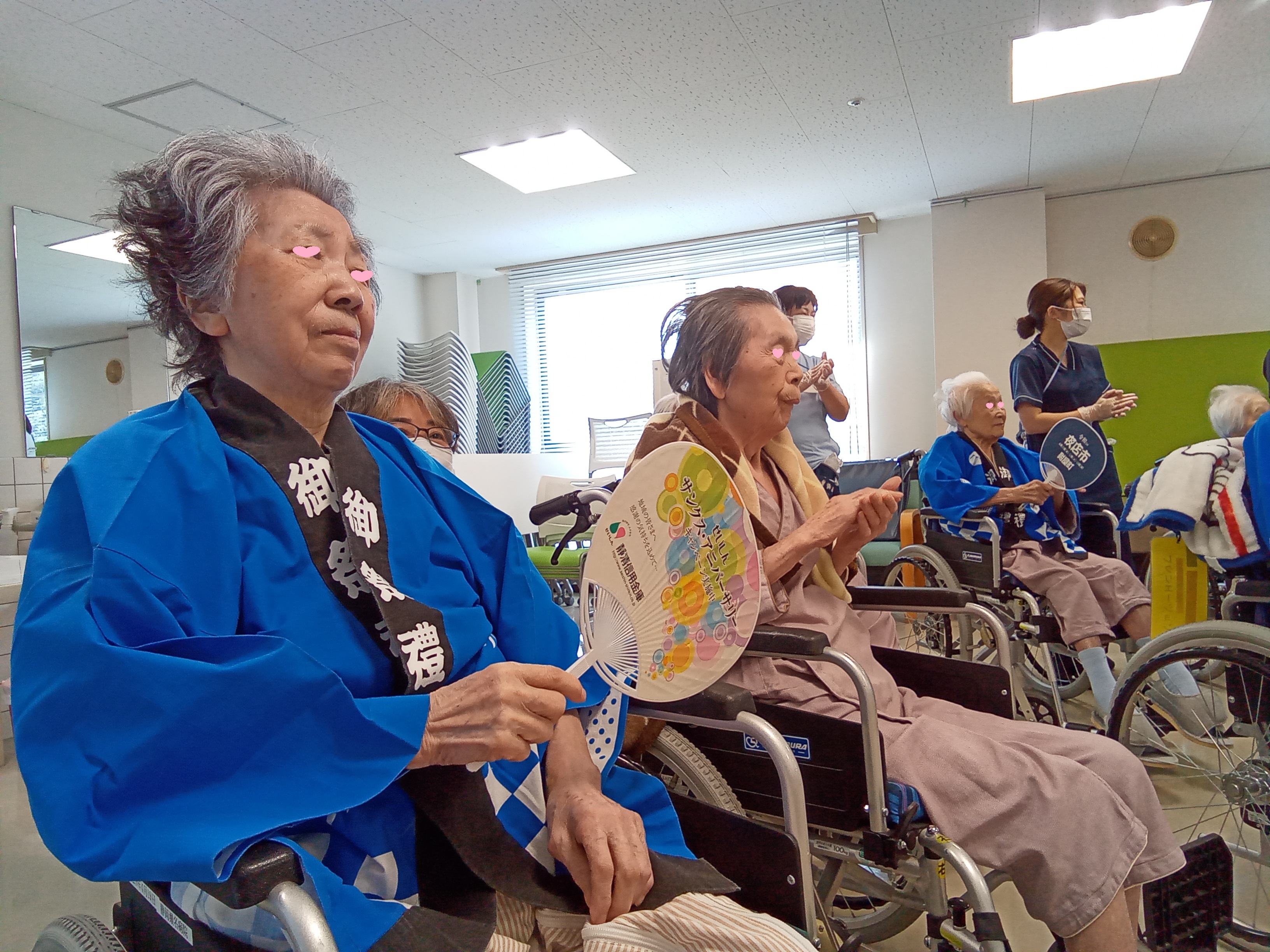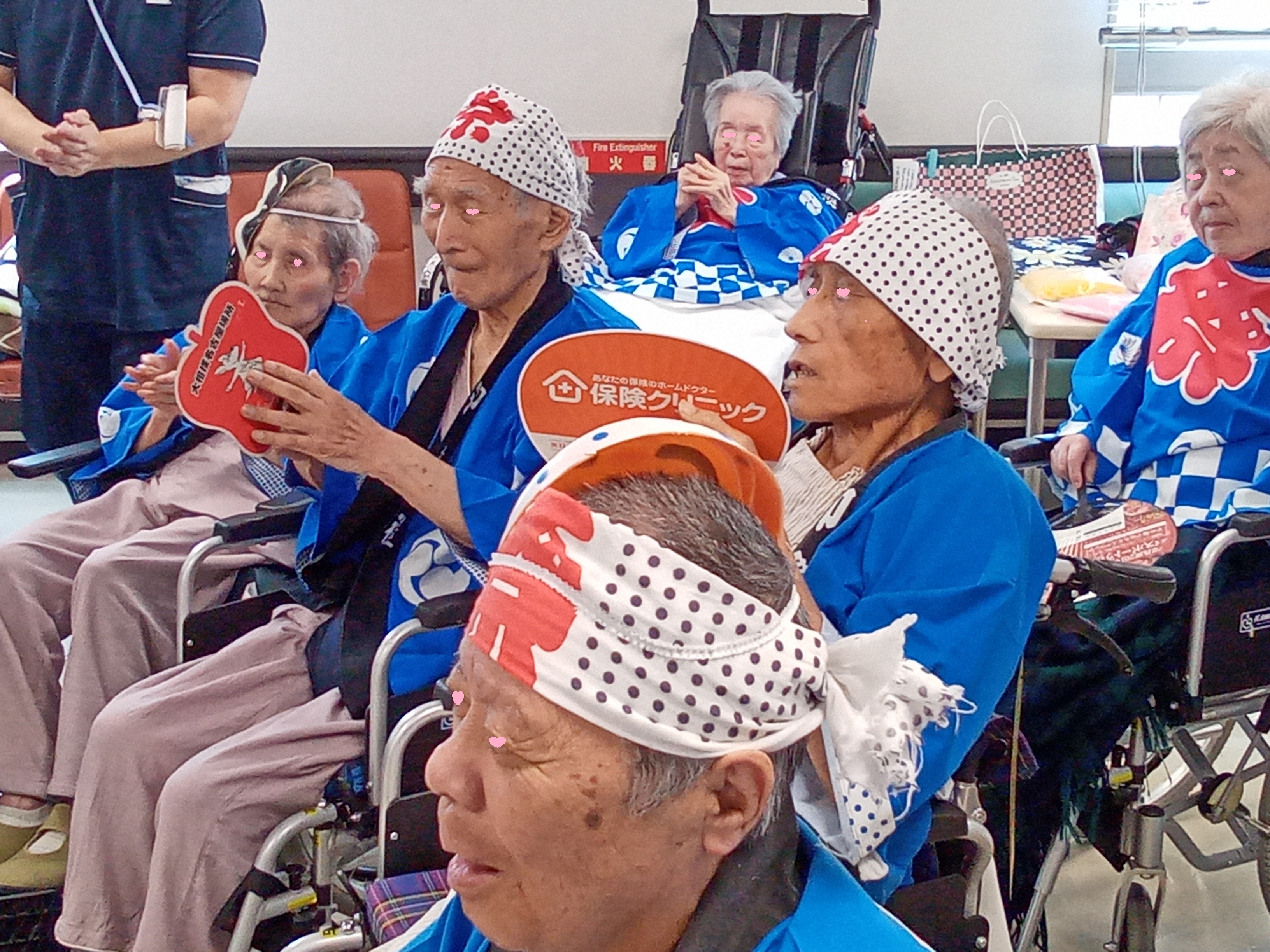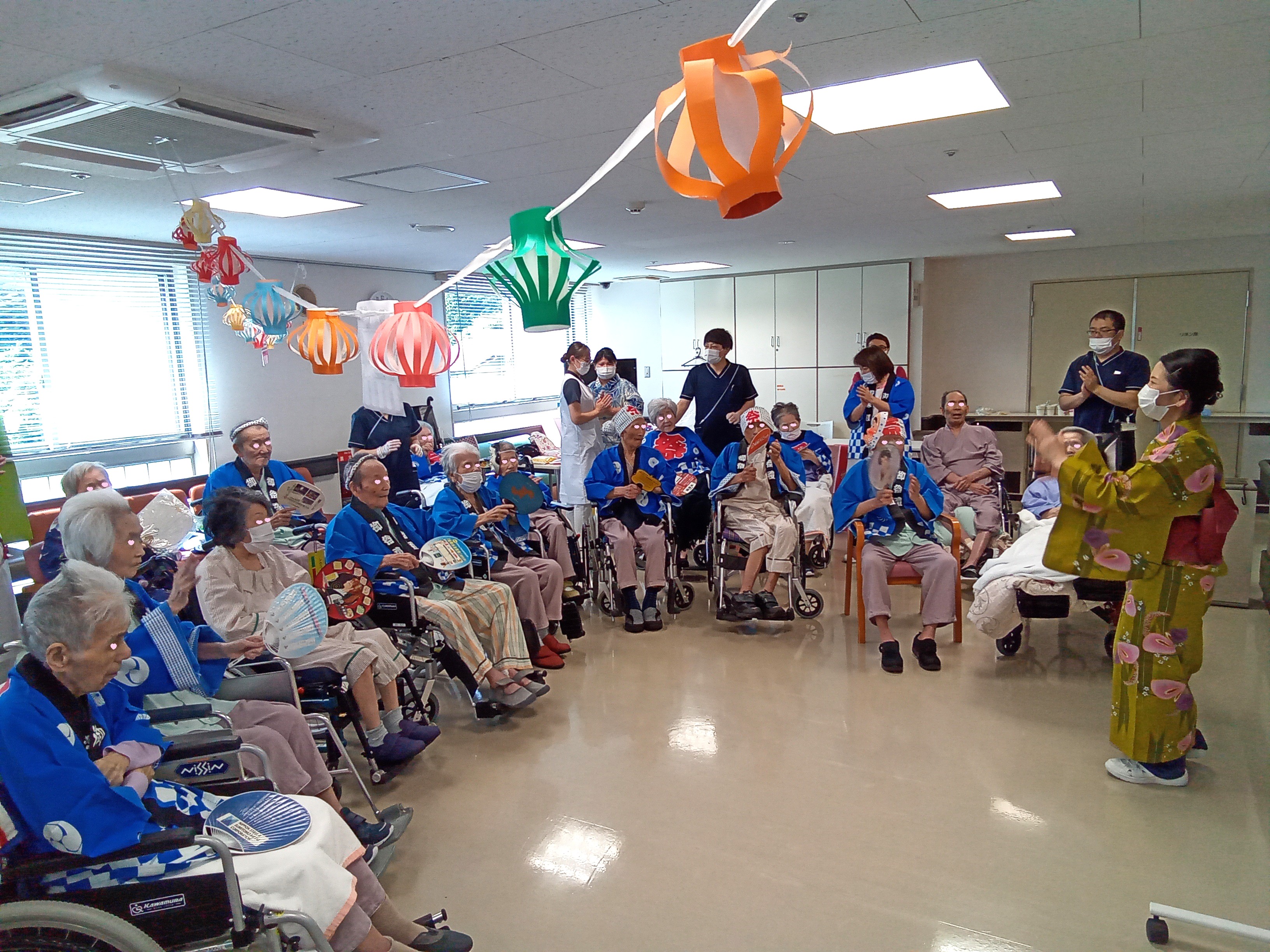 盆踊りでは職員のあでやかな浴衣姿に入所者様の手拍子が合わさって、お祭りを盛り上げていました。